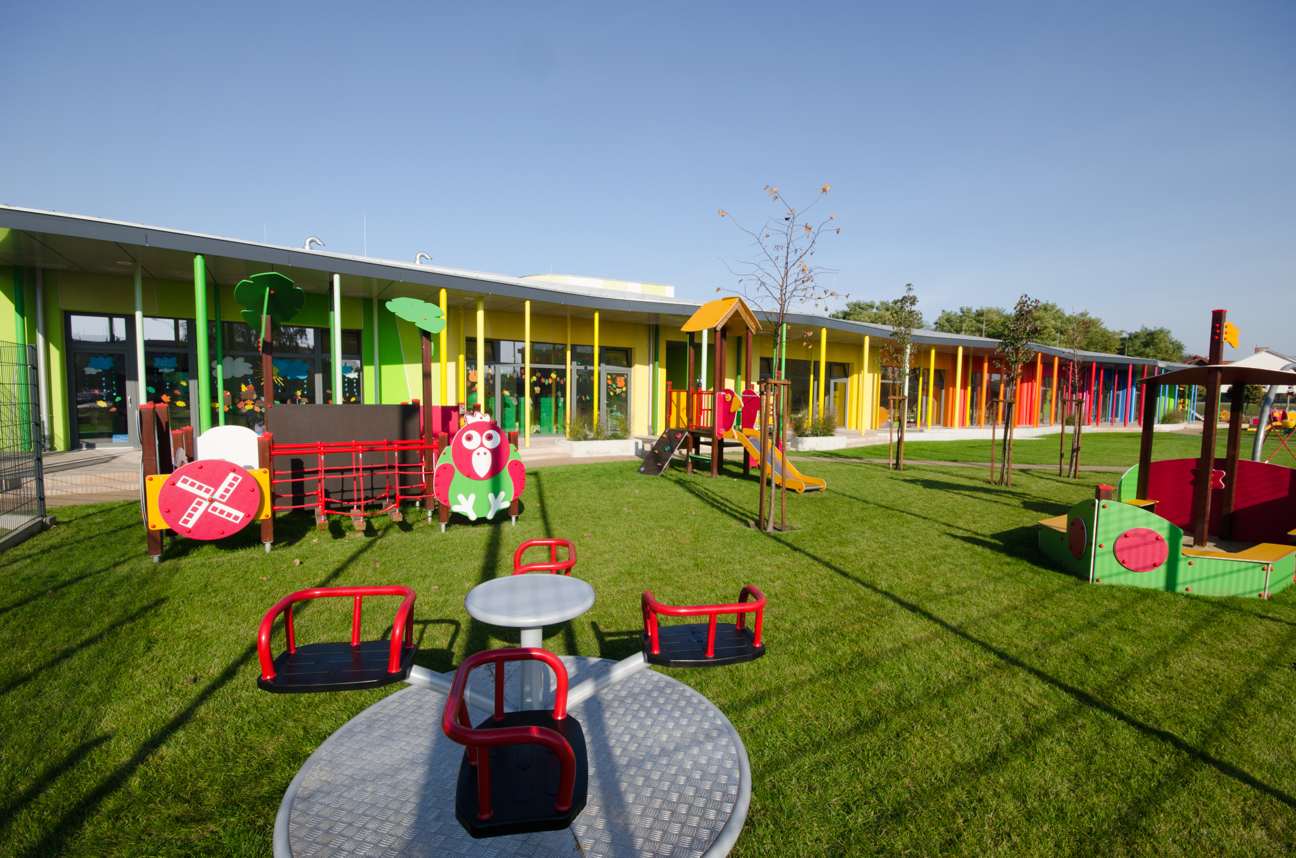 g) Przestrzenie zewnętrzne: placówka posiada kolorowy i bogato wyposażony plac zabaw wraz z ogrodem i tarasami, który zapewnia atrakcyjny pobyt na świeżym powietrzu. Zabawki i urządzenia dostosowane są do wieku maluchów oraz stymulują rozwój zdolności ruchowych.